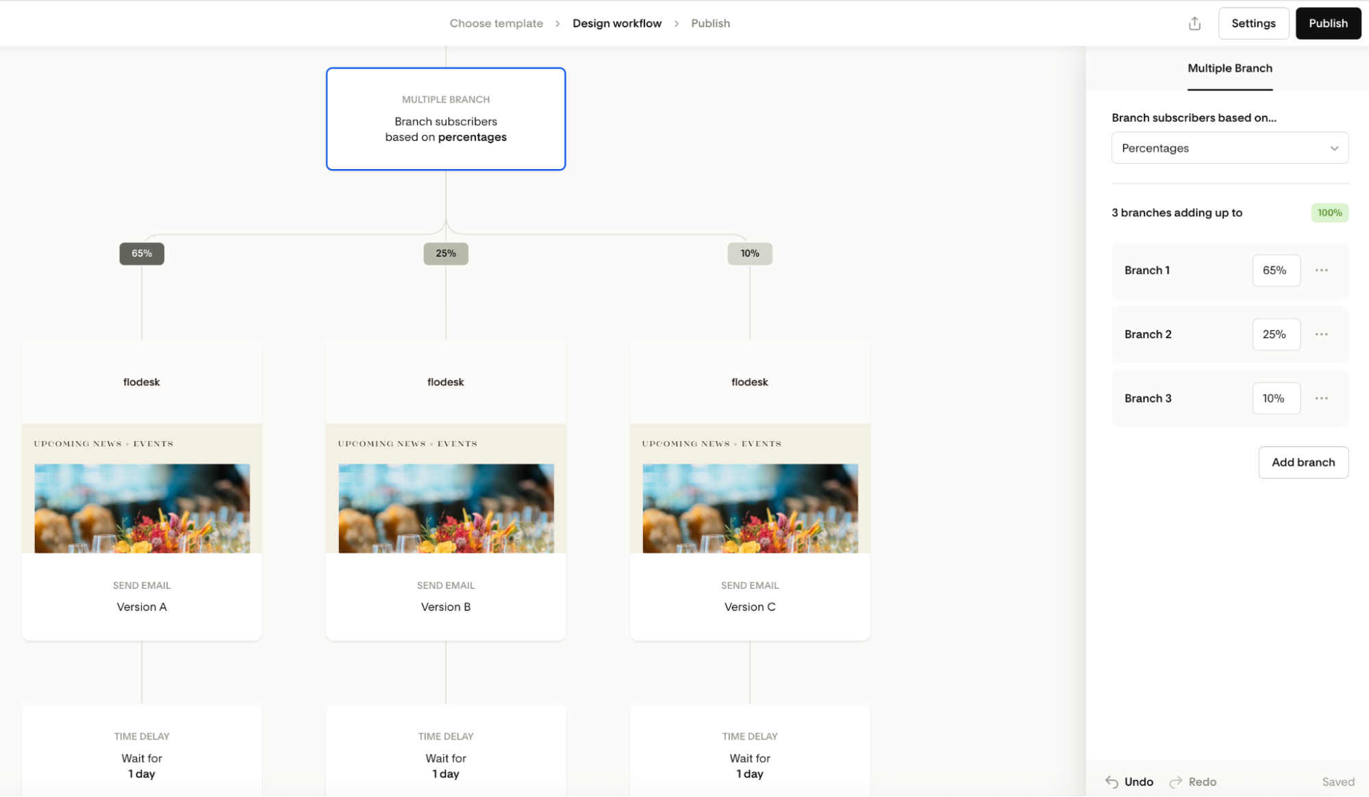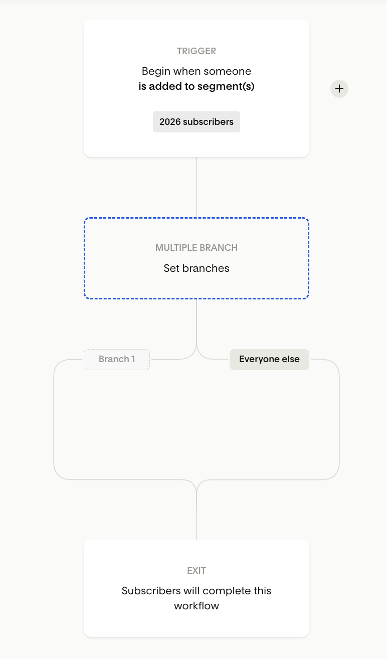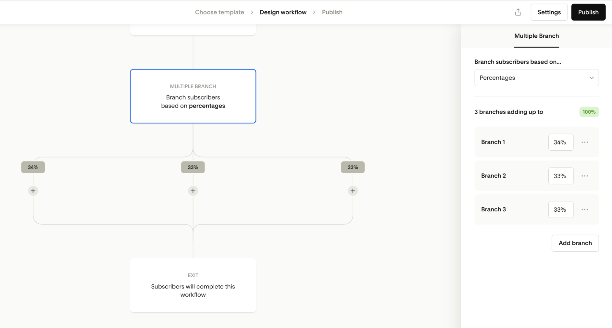 The Multiple branch step in workflows lets you split subscribers by data, segments, or percentages