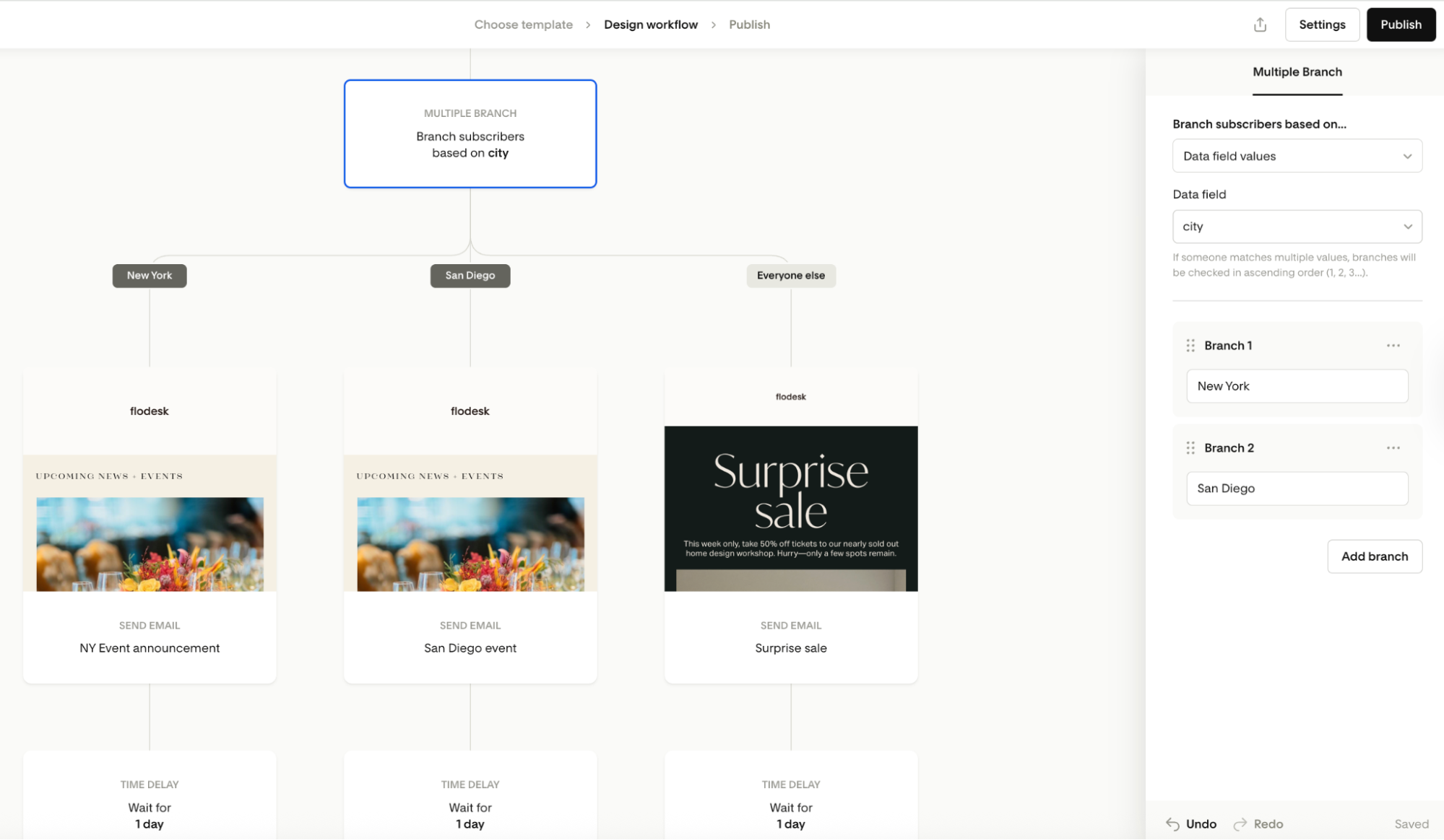 The Multiple branch feature gives you more control over how subscribers move through a workflow. Instead of creating endless, disconnected branches, workflows now flow: