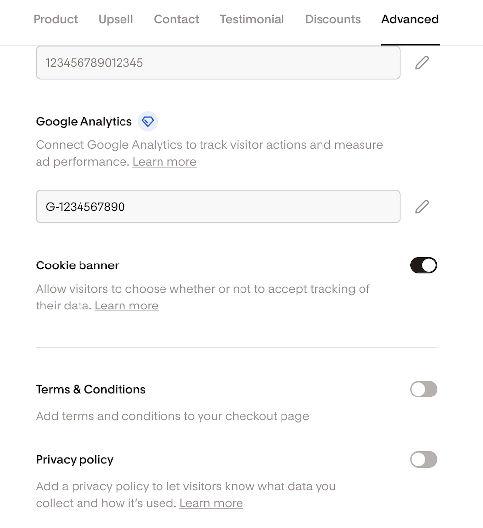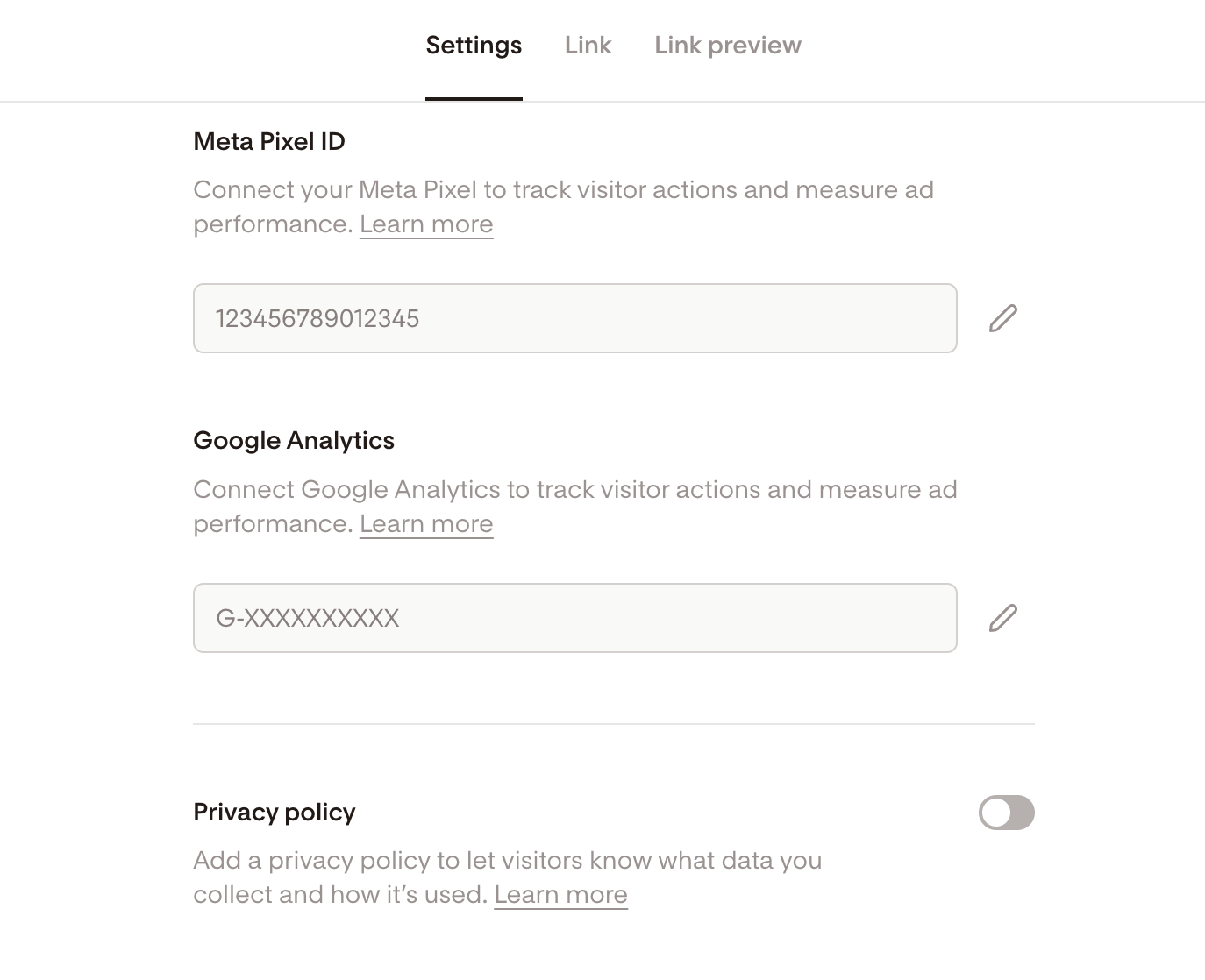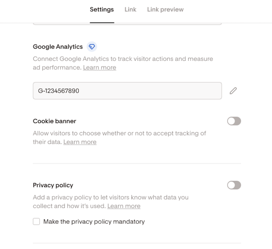In Settings, find the Google Analytics field, click the pencil icon to edit it and enter your Google Analytics measurement ID.