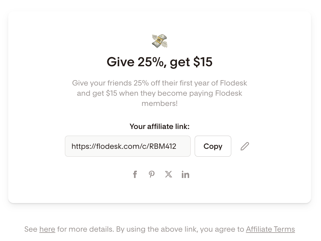 👉 Give your friends 25% off their first year of Flodesk and get $15 when they become paying Flodesk members!