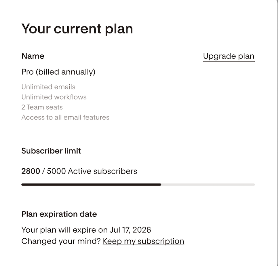 Important: if you’ve cancelled your annual plan, new subscribers added before your cancellation takes effect could still move your account into a higher tier, which may result in an additional charge.