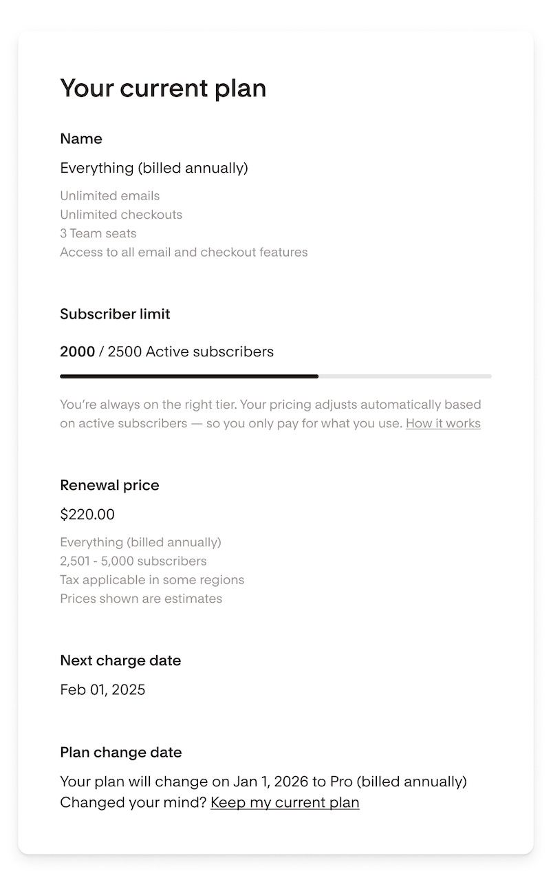 If your audience grows beyond 25,000, Flodesk will automatically upgrade you to Pro so your emails continue sending without interruption.