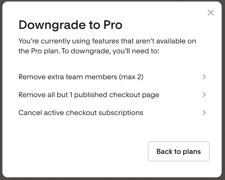 Downgrading to a lower plan (like from Everything → Pro or Pro → Lite) means you’ll lose access to certain features, and you may need to make changes before you can confirm the downgrade.