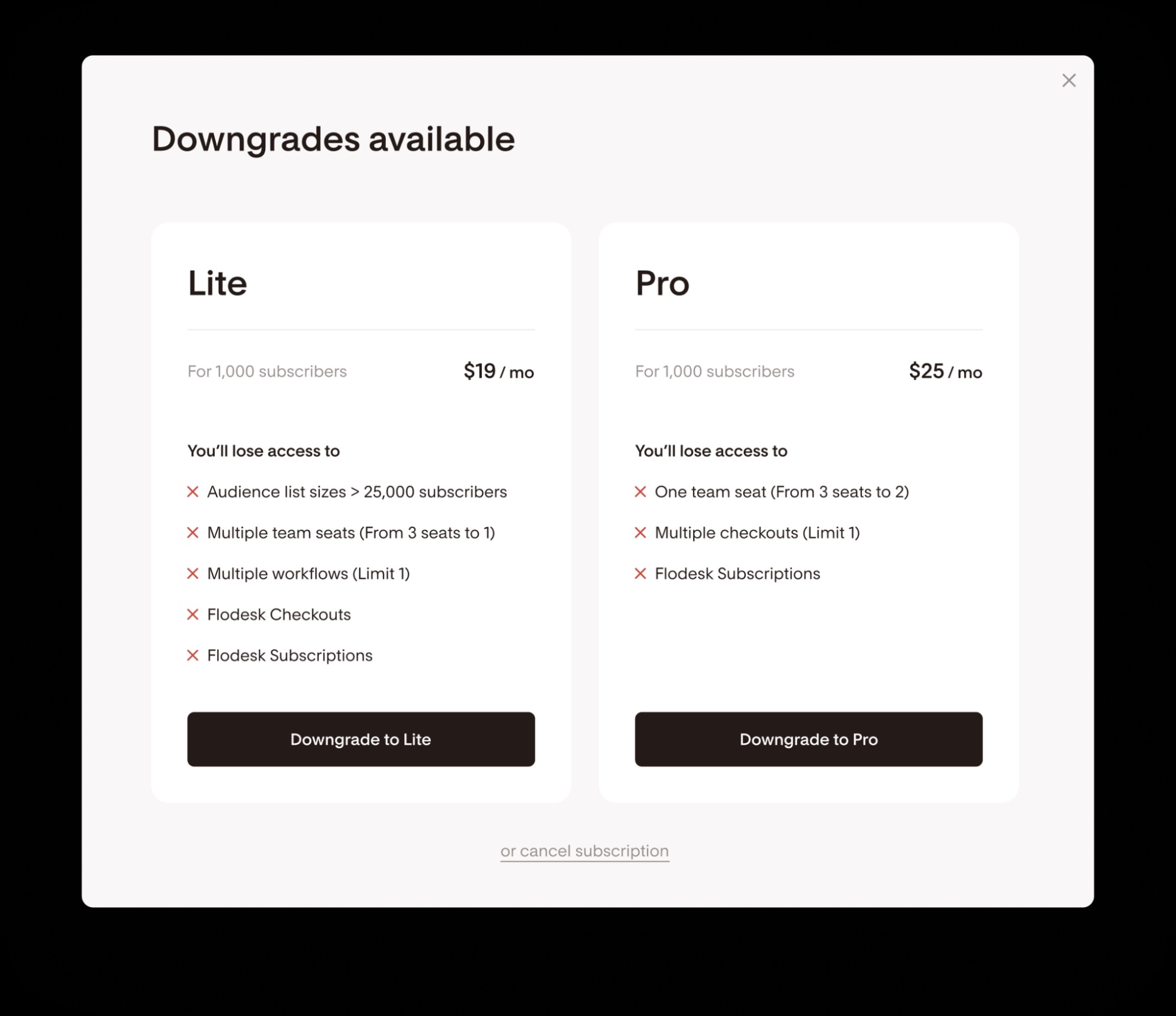 Before you can confirm, Flodesk checks if you’re using any features that aren’t included in the new plan.