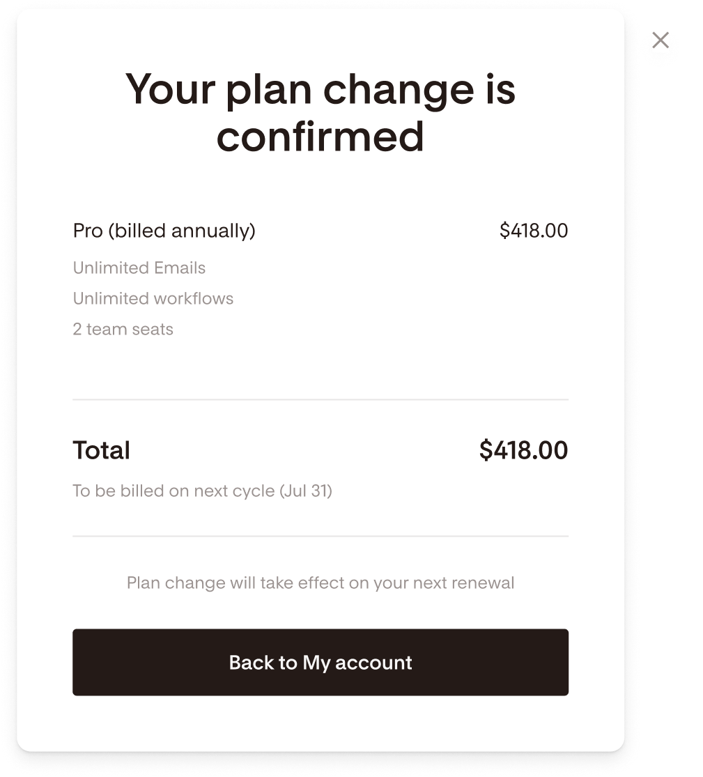 You’ll see a confirmation screen showing your new plan details and billing total.