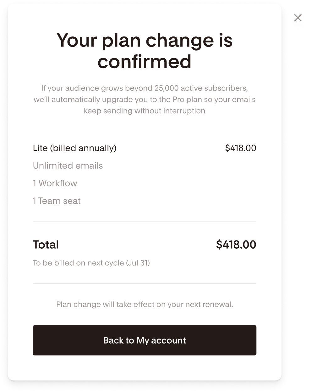 Over 25,000 subscribers: If you schedule a downgrade to Lite but then go over 25,000 subscribers, we will automatically remove your downgrade to Lite and change your downgrade to Pro instead.