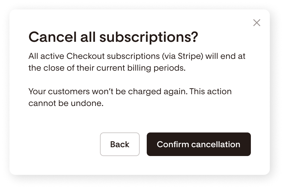 Checkouts and subscriptions: Canceling active Checkout subscriptions is permanent and cannot be undone. The only way your buyers can continue their subscriptions is to re-purchase through a Flodesk Checkout page.