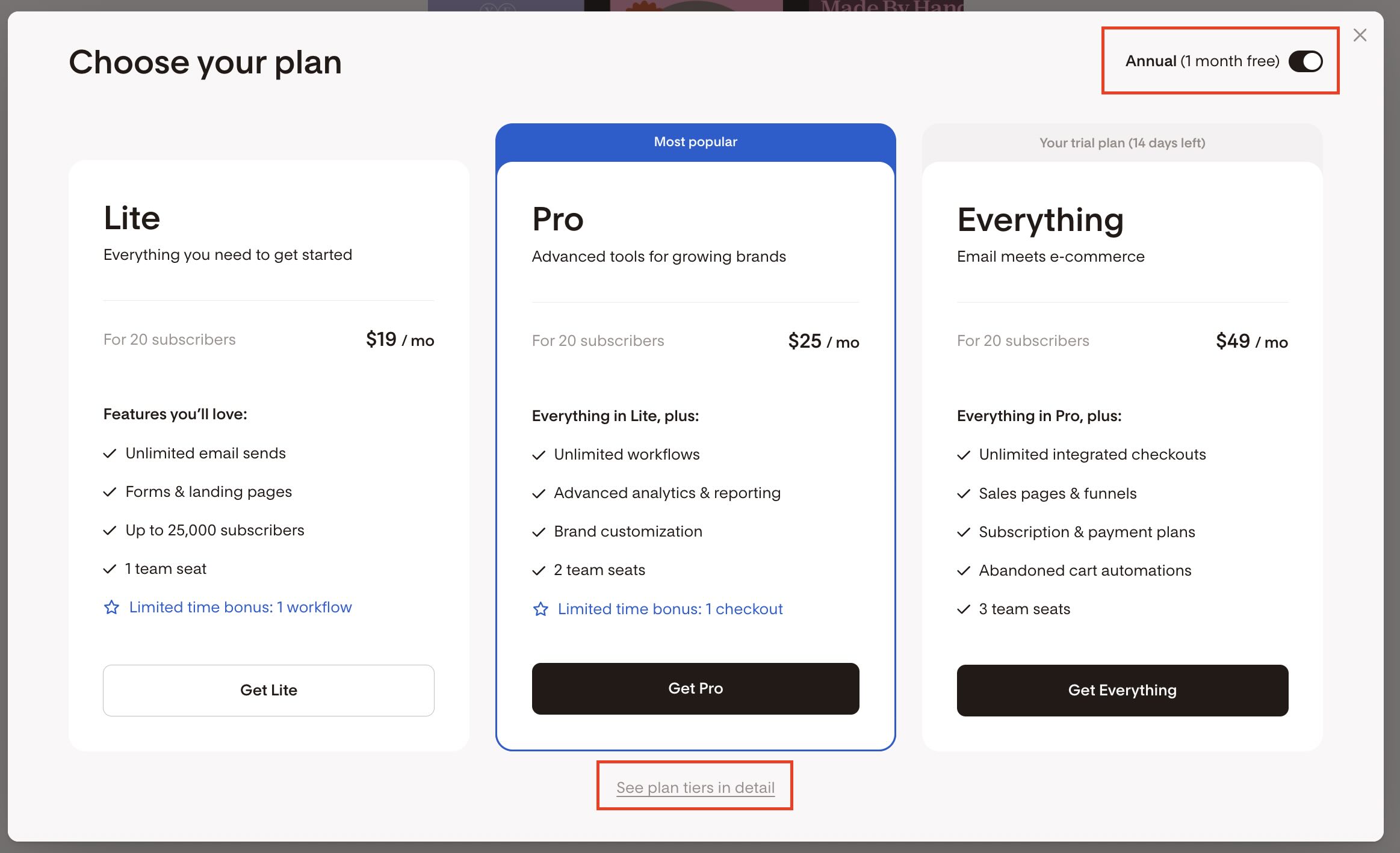 If you want to switch between monthly and annual billing without losing access to unlimited emails and subscribers, reach out to our Member Experience team. We’ll make sure you’re still locked in for as long as you keep your current plan.