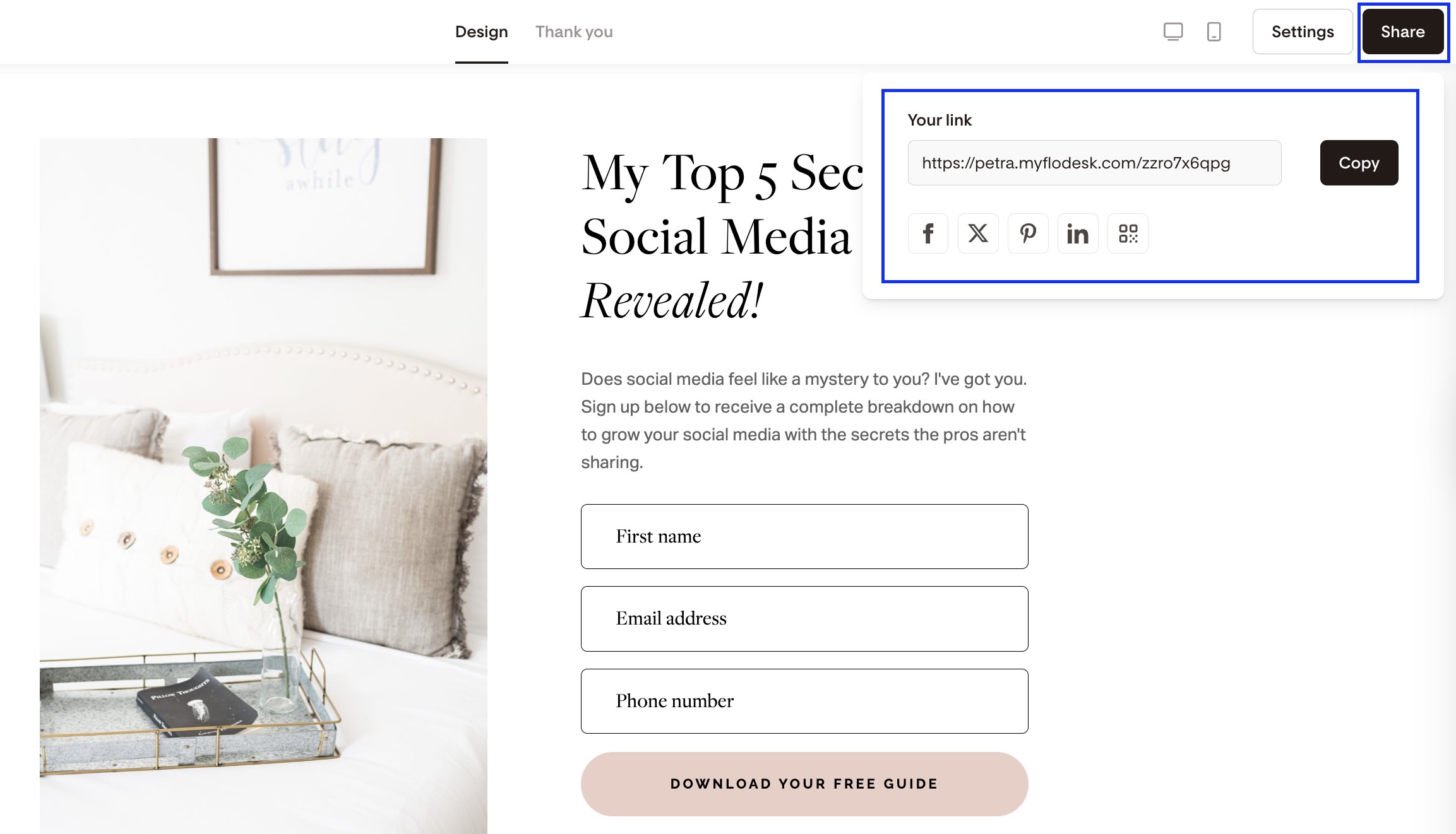 Flodesk lets you share opt-in forms using simple, shareable links—no coding required.