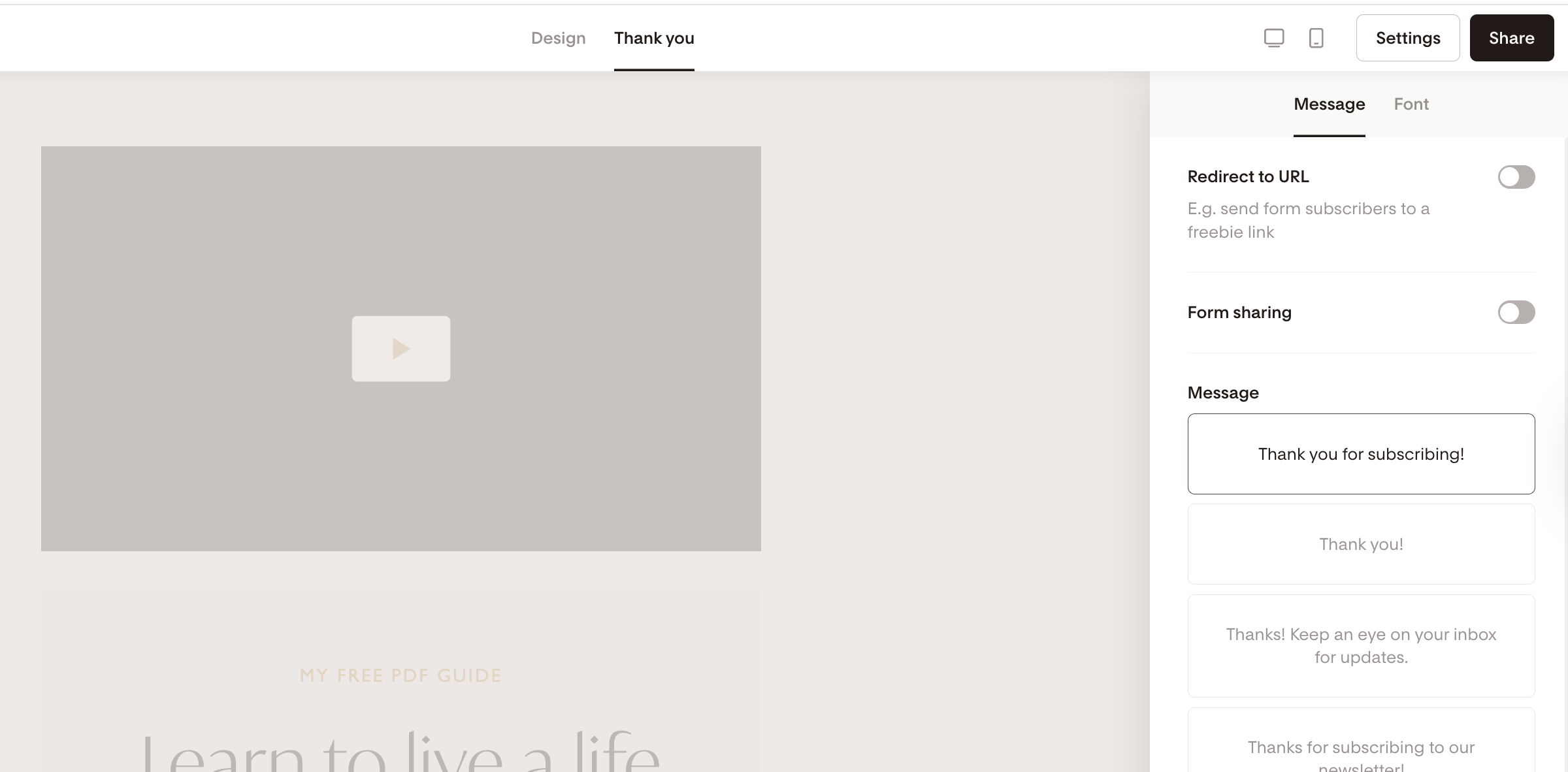 To edit your success message's font and font style, click the Font tab in the right side panel to access all the font options.