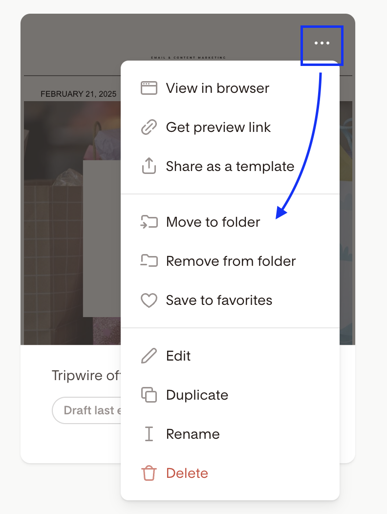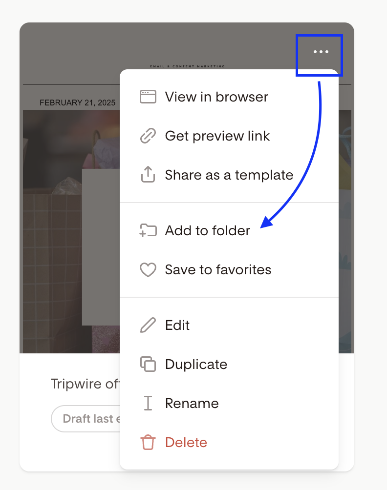 On the main listing page for Emails, Forms, Workflows, or Checkout hover over the item you want to organize, click the three-dot menu (...), and select "Add to folder". Choose an existing folder or create a new one.