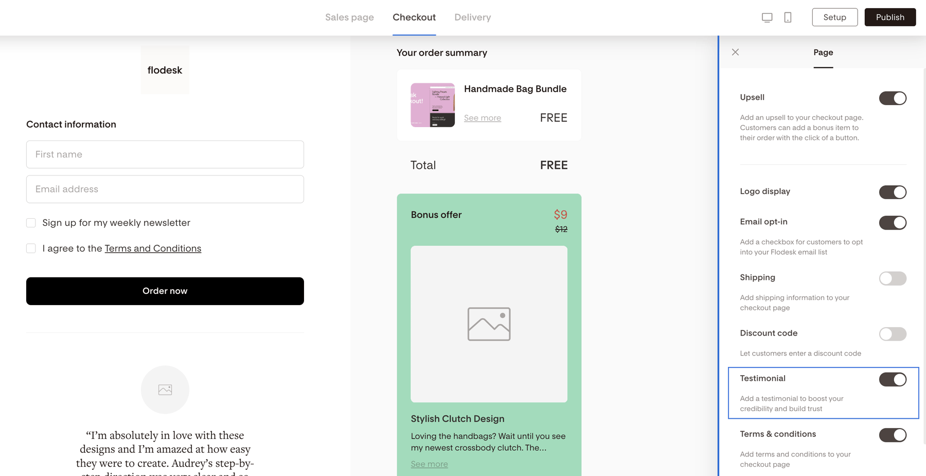 Toggle Upsell or Testimonials off