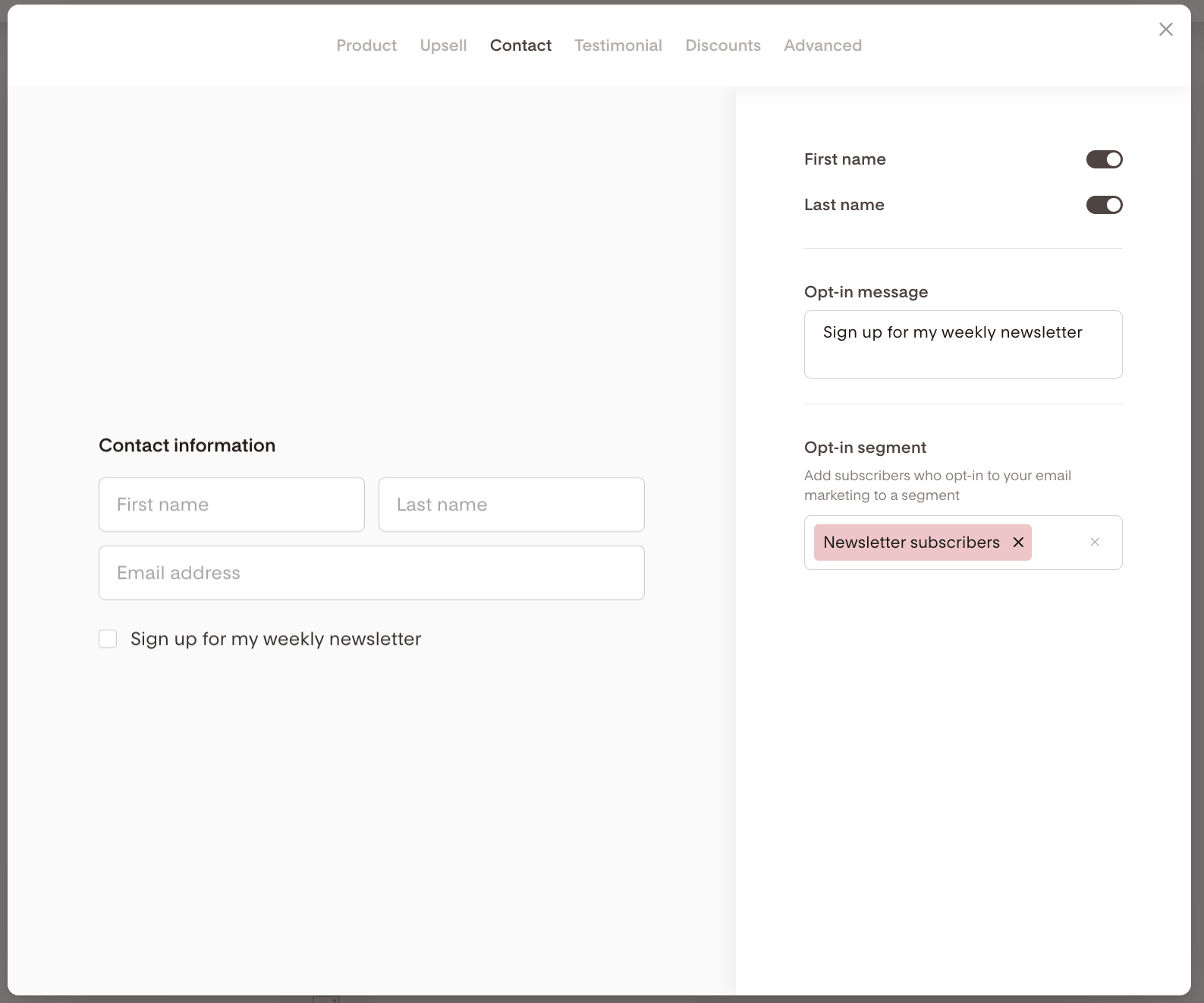 Newsletter opt-ins → set under the Contact tab
