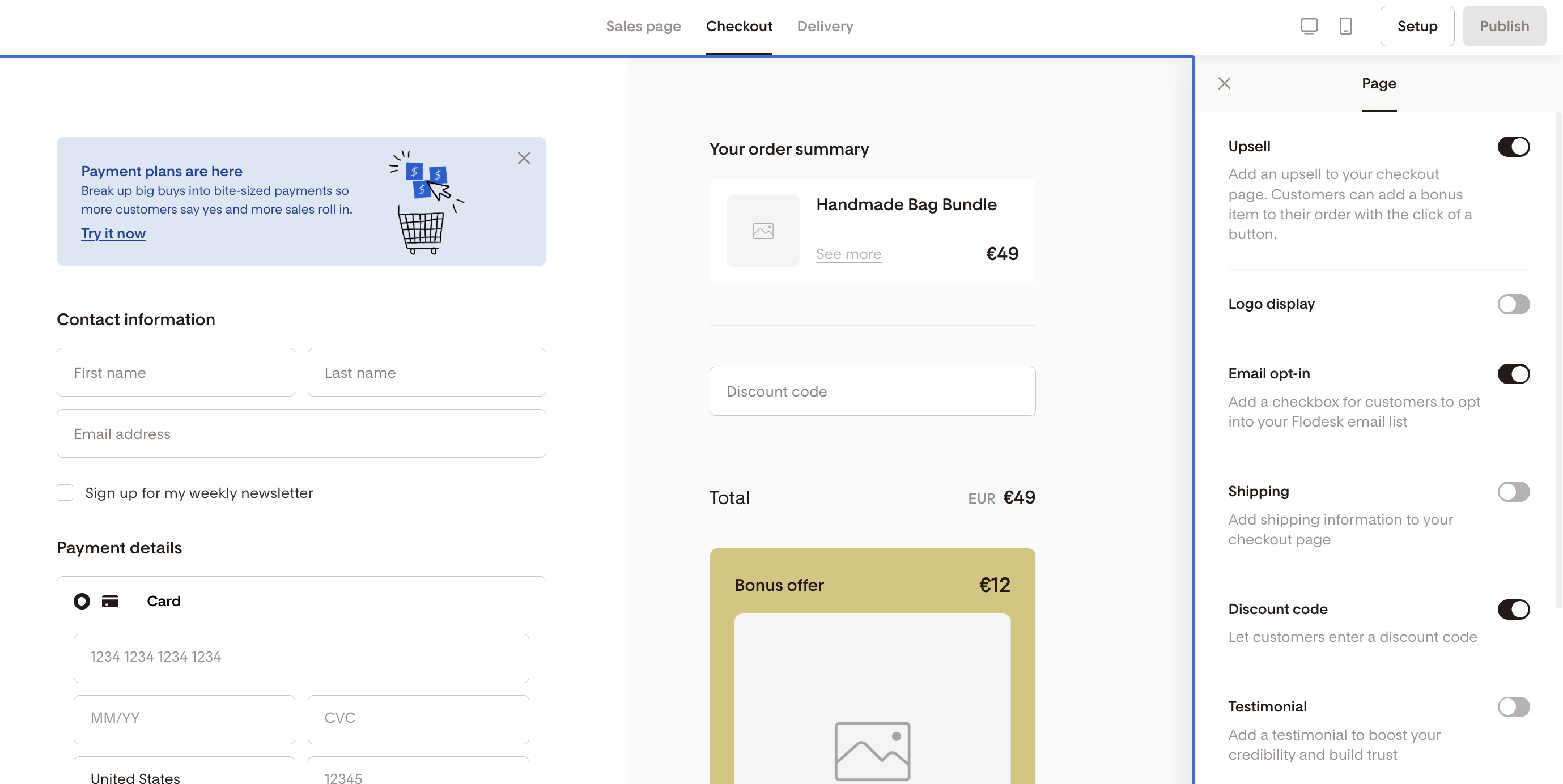 To turn on any element on the page, toggle the slider to the the right. To turn off any element, toggle the slider to the left. For example, if you don’t want an upsell, all you have to do is toggle the slider next to Upsell to the left. If you want to collect Shipping information from your buyers, turn on the "Shipping" toggle.