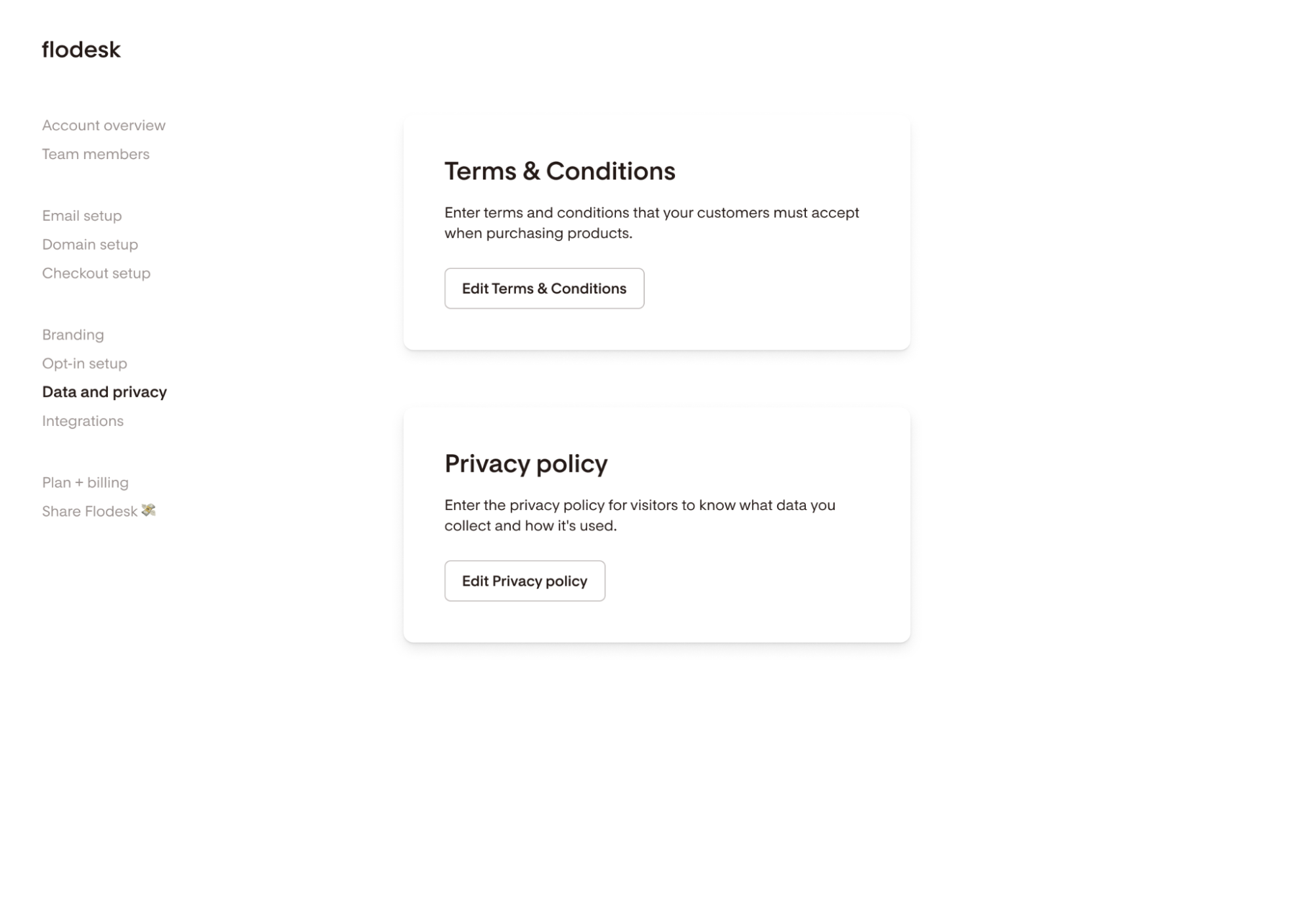 Important: Please note that Flodesk cannot provide legal advice. Please consult with your attorney to ensure your business Terms & Conditions and Privacy Policy are compliant with your local laws and regulations.
