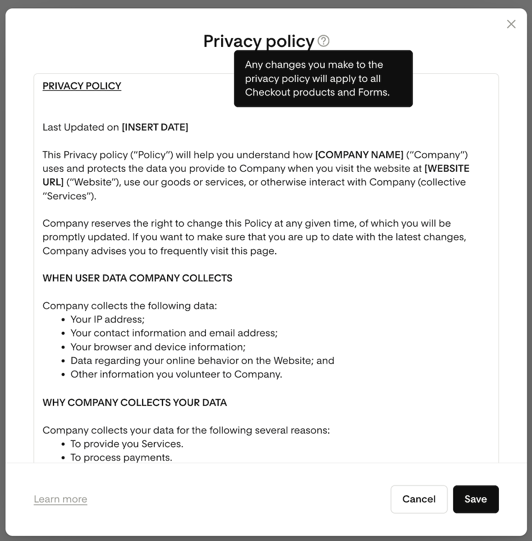 You can edit these policies either from My Account > Data and privacy or directly in the form/checkout builder.