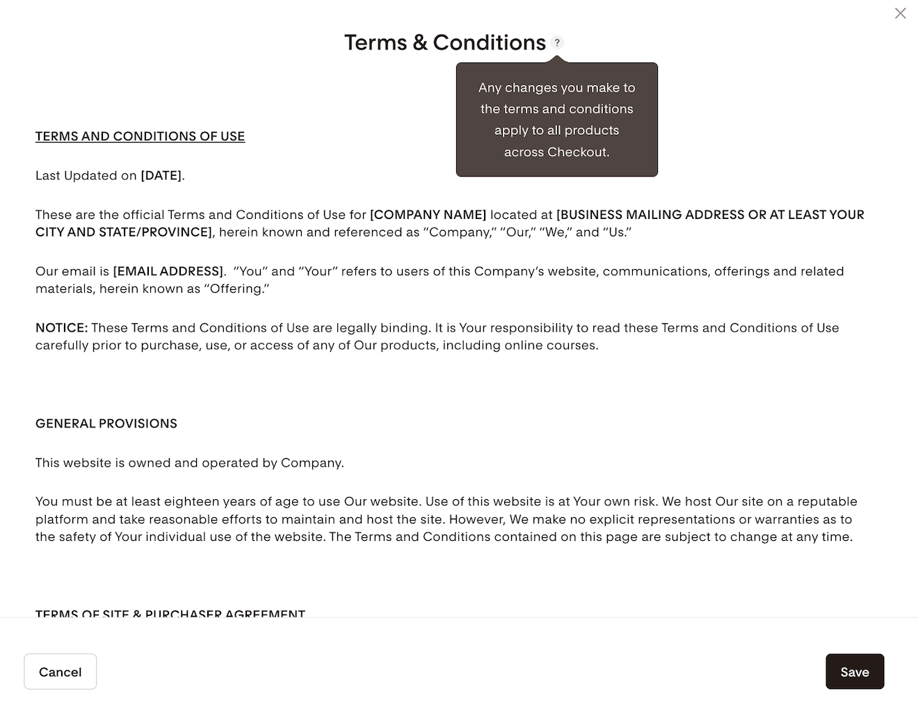Editing the Privacy Policy and Terms & Conditions in the checkout builder