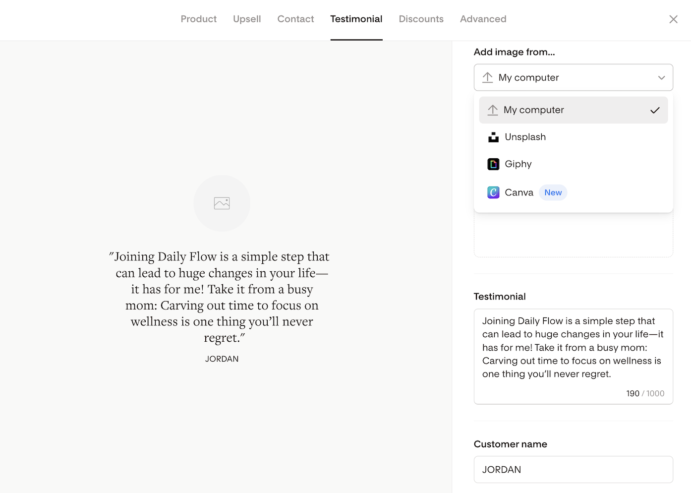 To add a photo, you can upload an image from your computer or pull one in from Unsplash, Giphy, or your connected Canva account. A photo alongside the testimonial makes the social proof feel more genuine and personal.