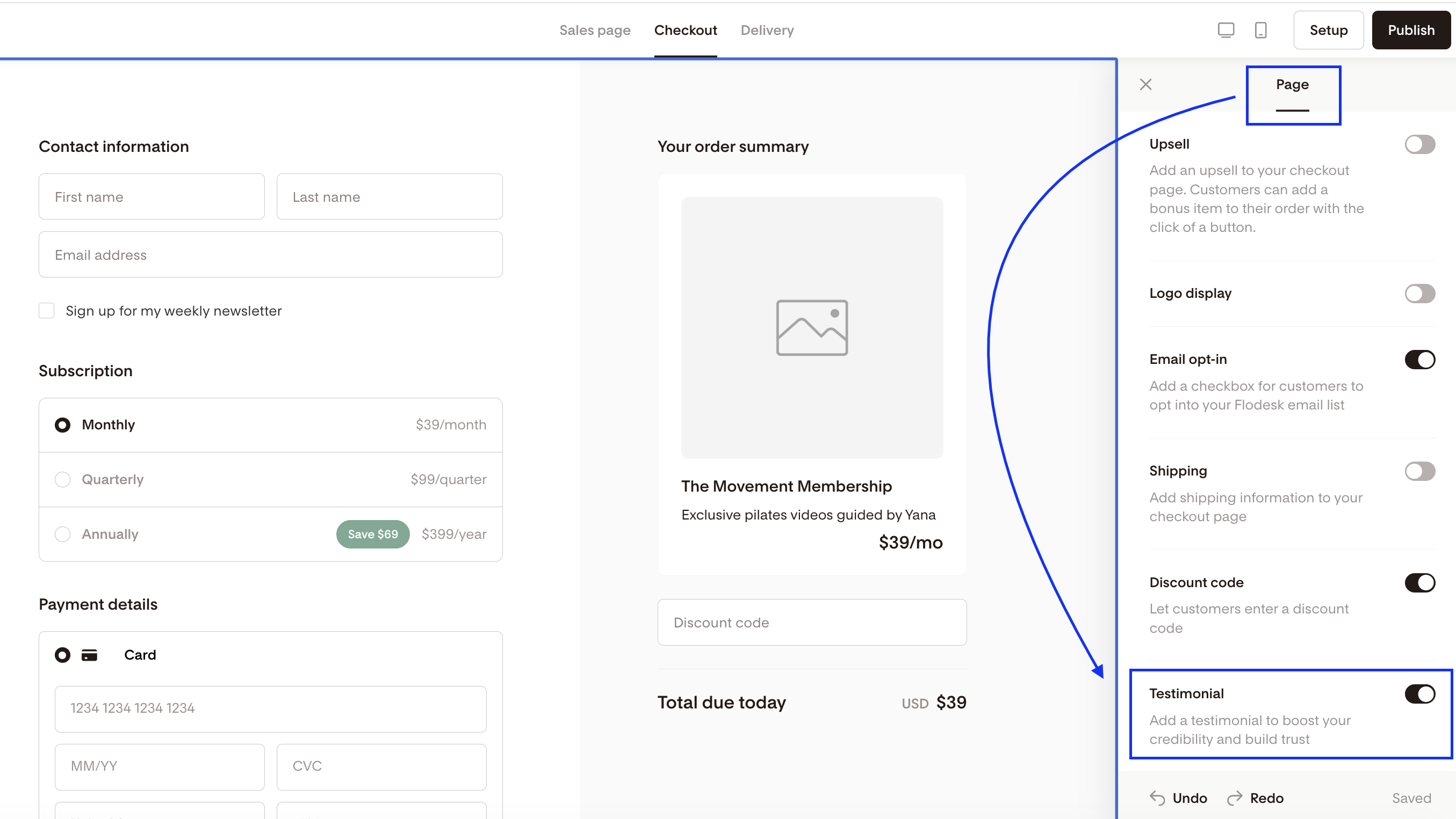 Open your checkout, click Setup in the top-right corner, and select the Testimonial tab. Click into the text fields to add the testimonial and the customer's name, and upload a photo if you have one. Changes appear in the preview automatically.