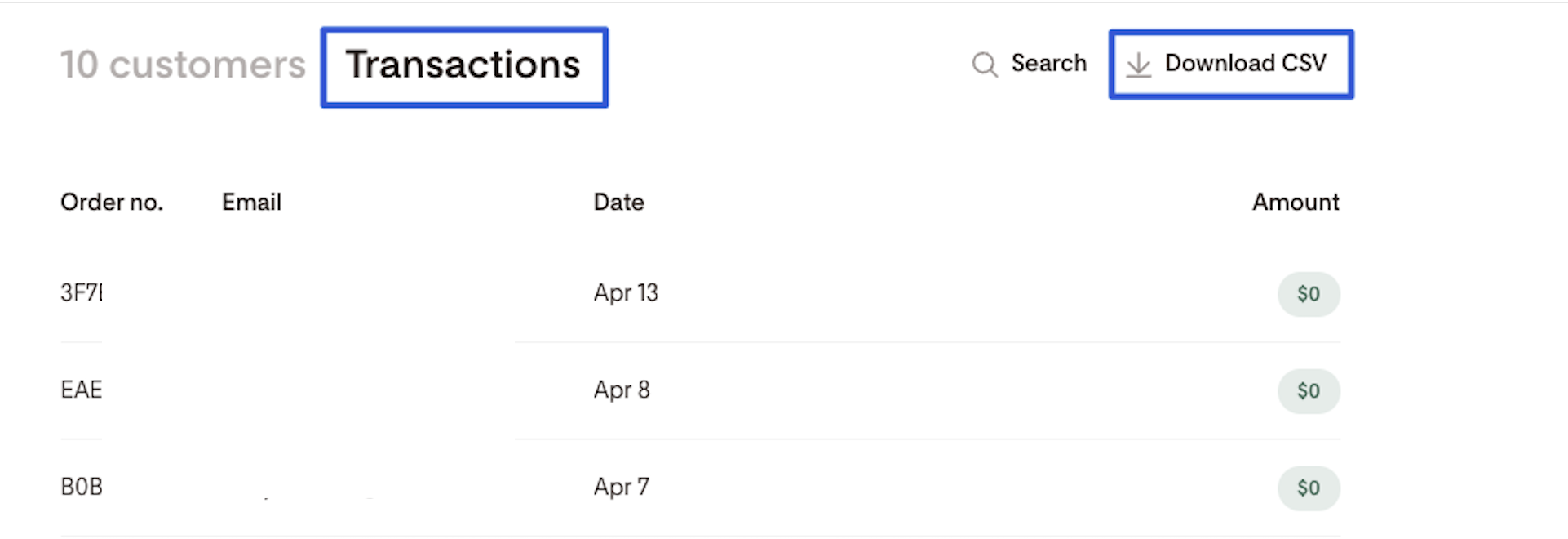 On this page, go to the "Transactions" tab, and then select Download CSV. The CSV file includes each buyer's submitted shipping address along with other order details.