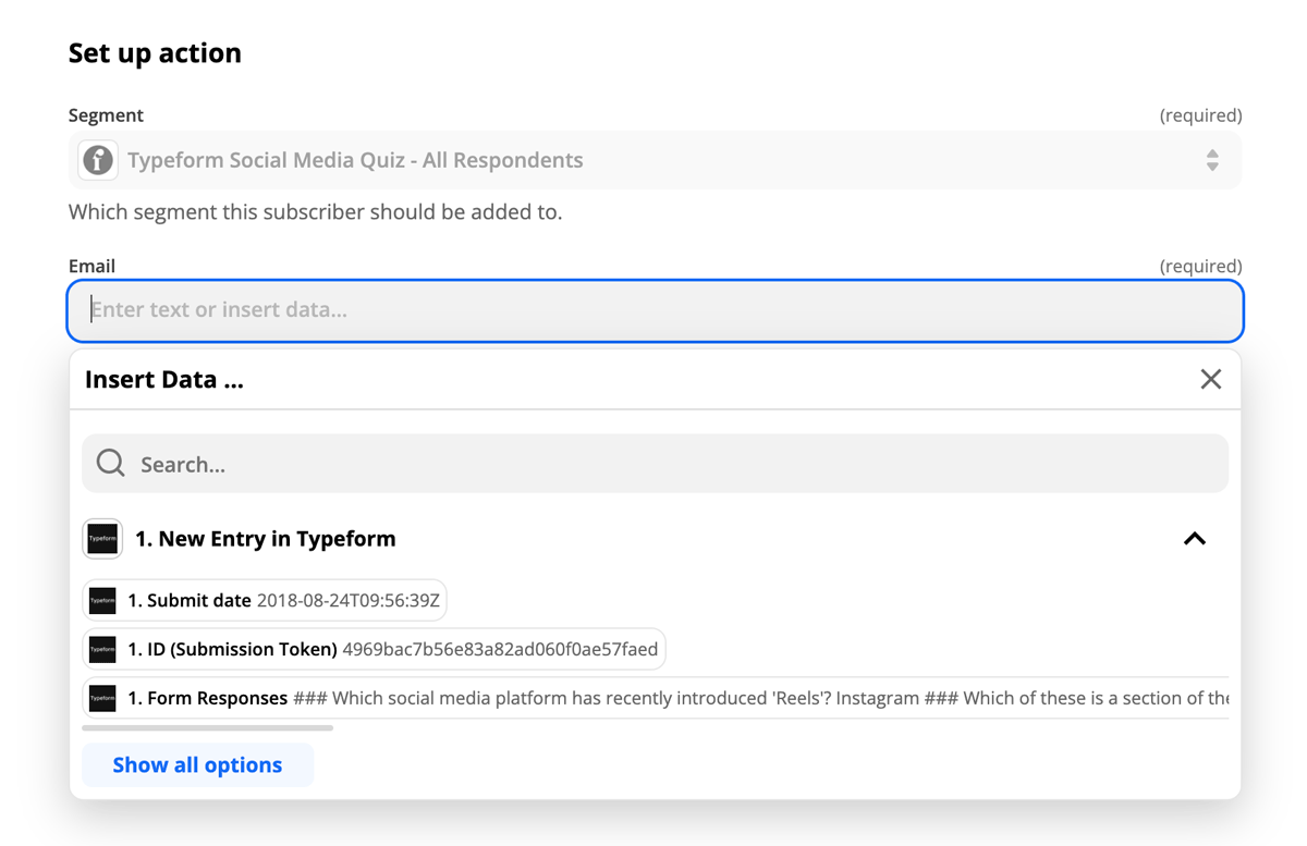 Map the email field in Zapier to the email field from Typeform. If you don't see the email field in the dropdown, click Show all options. You can also map any additional fields you'd like to carry over, such as name.