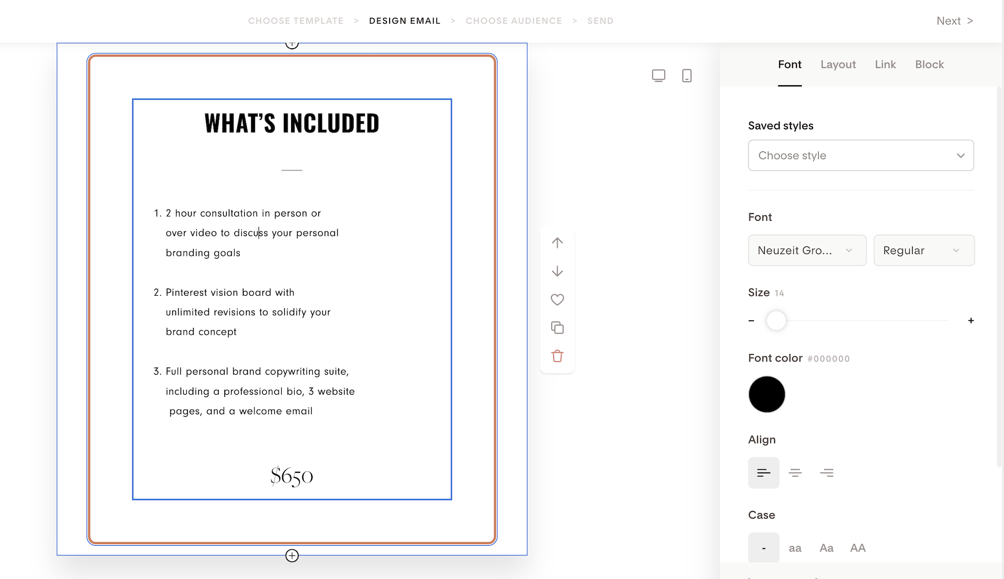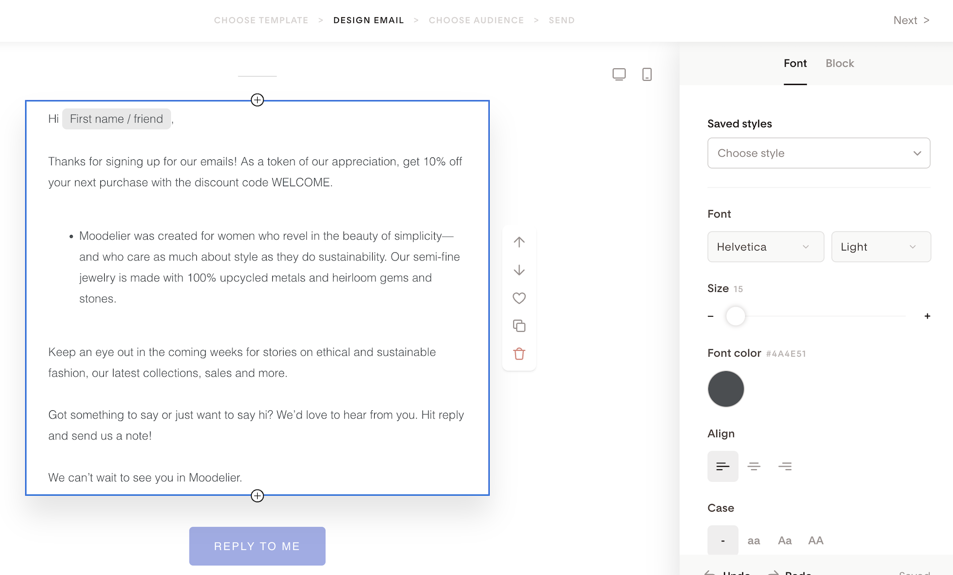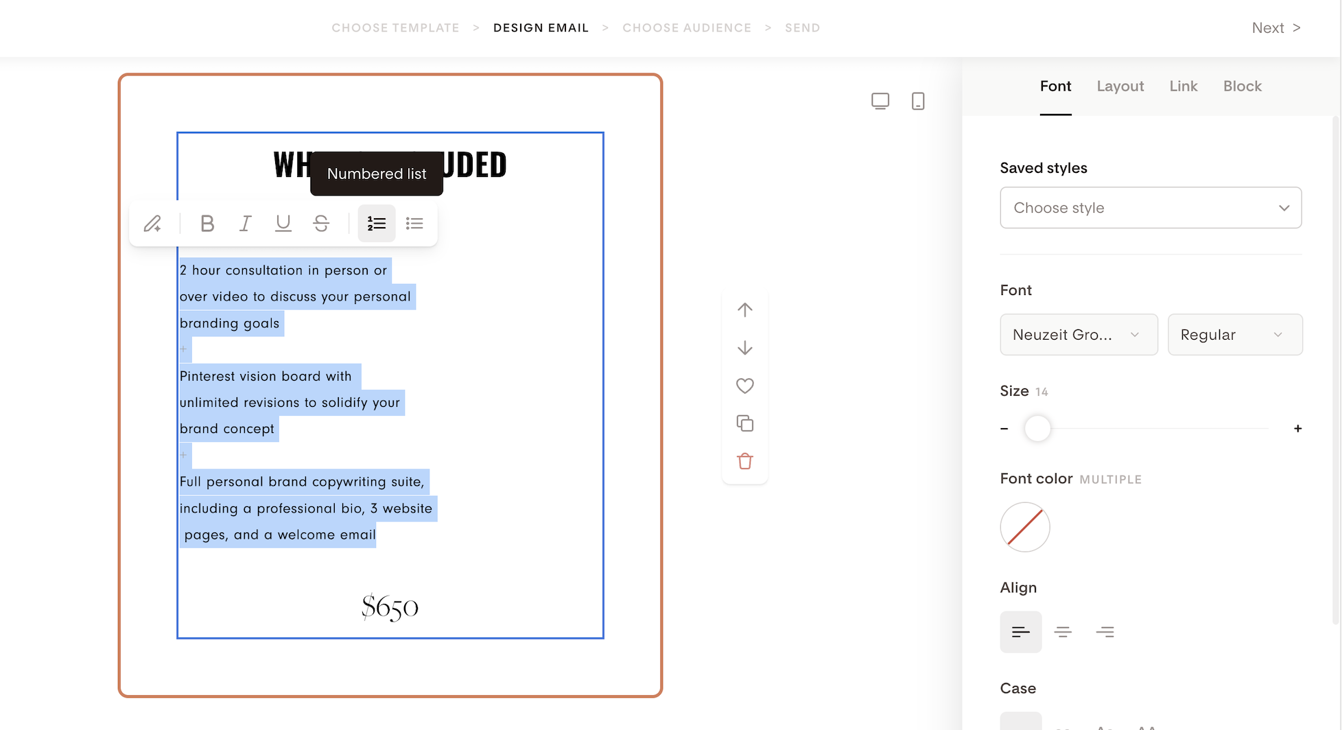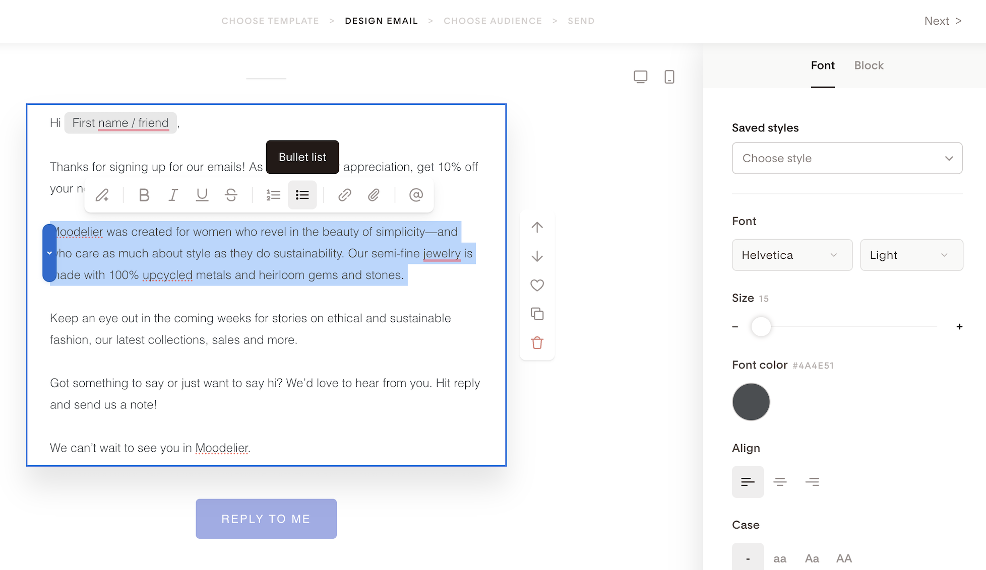 Bullet points and numbered lists are a good way to break up text and make your emails easier to scan. You can add them to both Text blocks and Layout blocks using the quick formatting panel that appears when you highlight text in the email builder.