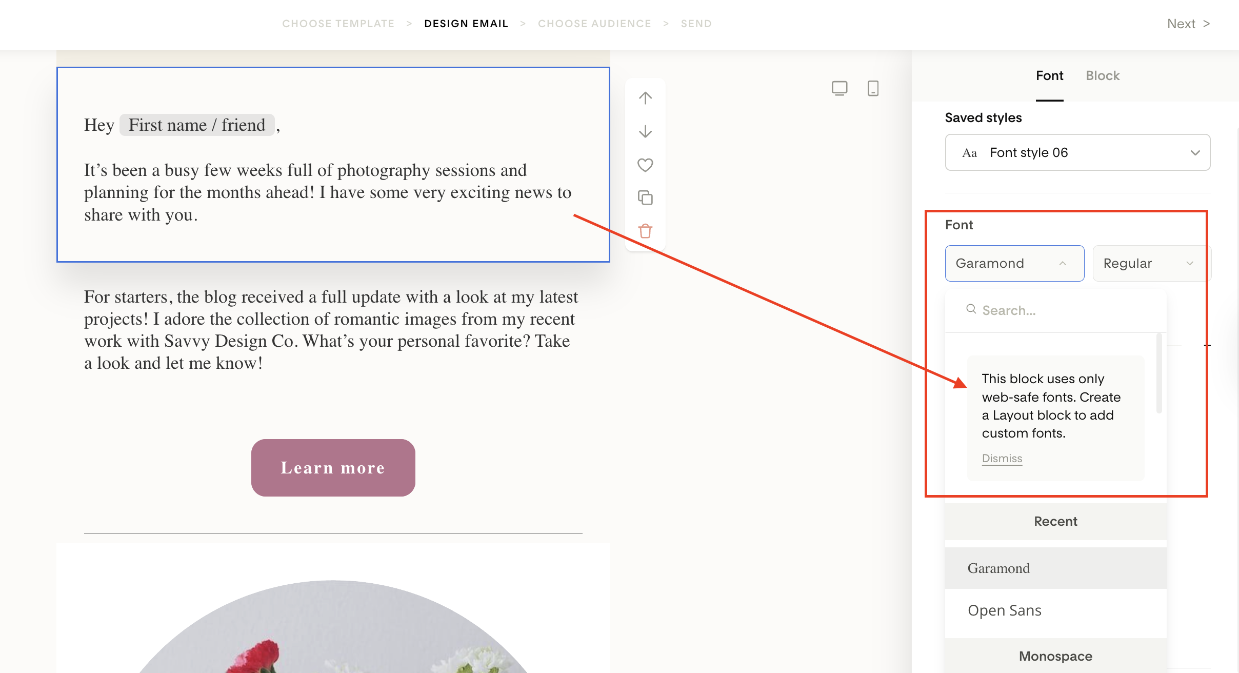 Why am I not seeing custom fonts in the email builder Text Block?