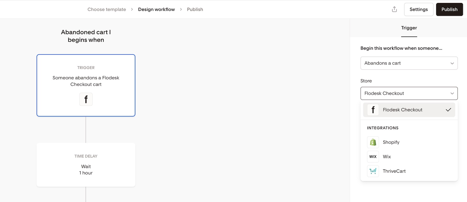When a customer starts to purchase but doesn't complete it (abandons a cart), Flodesk captures the event and uses it to trigger your connected workflow.