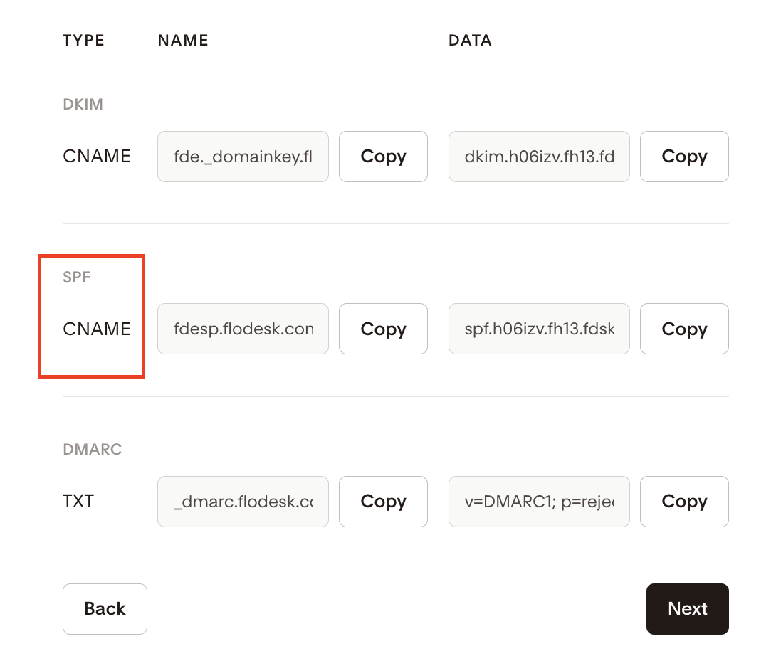 Flodesk provides CNAME SPF records. These are not the same as TXT SPF records that other ESPs may give you.