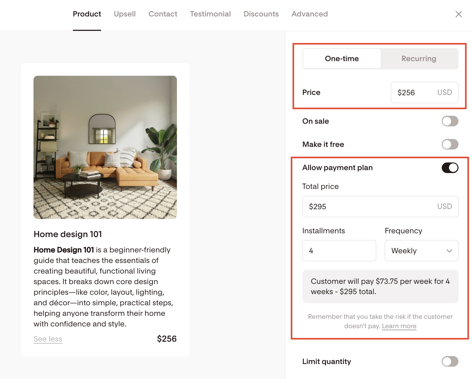 In the One-time product tab, turn ON Allow payment plan.
