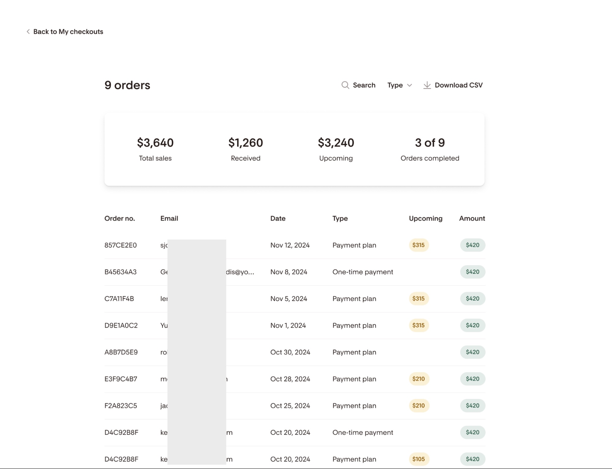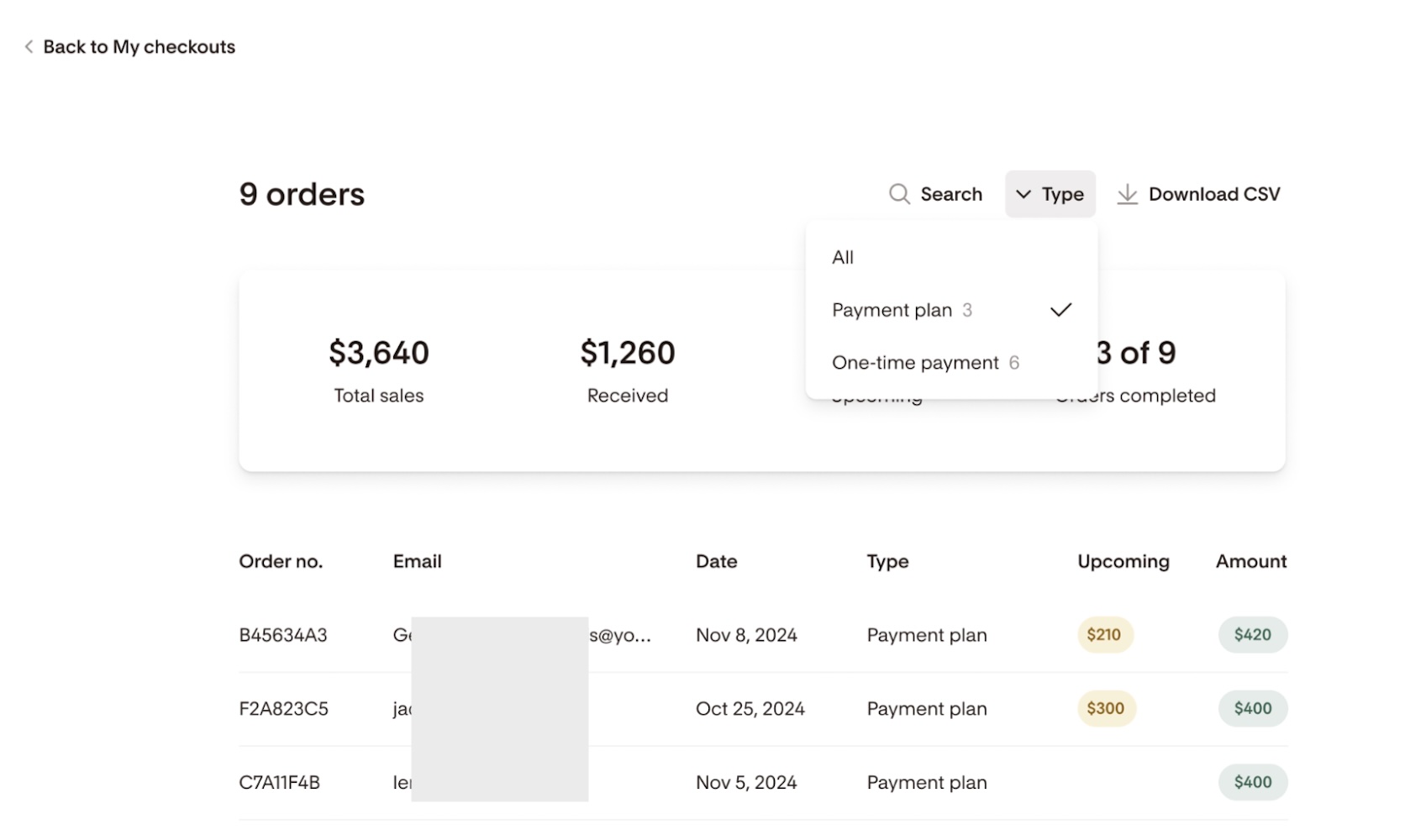 Clicking “View orders” allows you to deep-dive into the data. Each payment plan order includes a detailed payment schedule so you can see which installments are completed, upcoming, or past due.