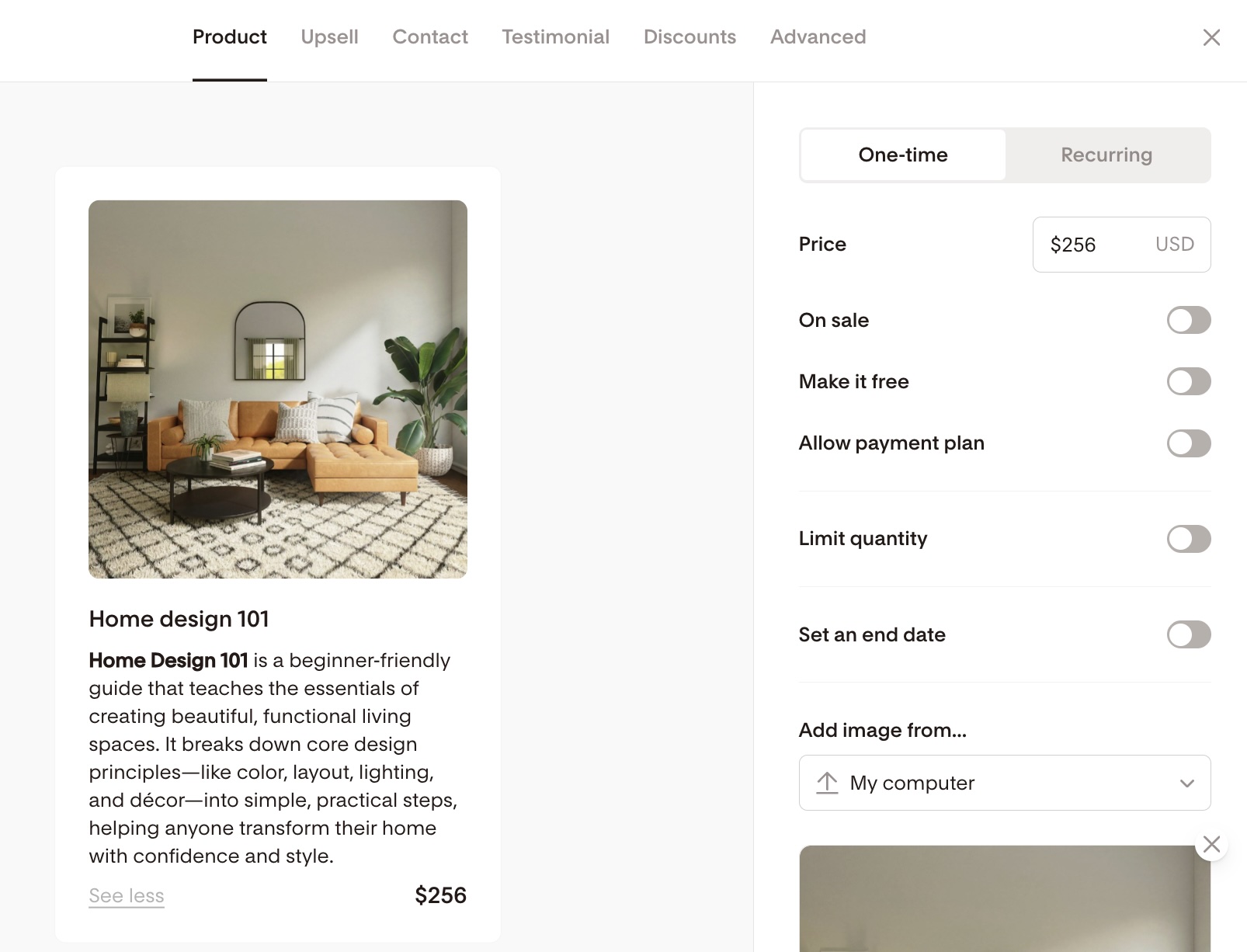 In the Checkout builder, go to the One-time product tab → toggle ON Allow payment plan.