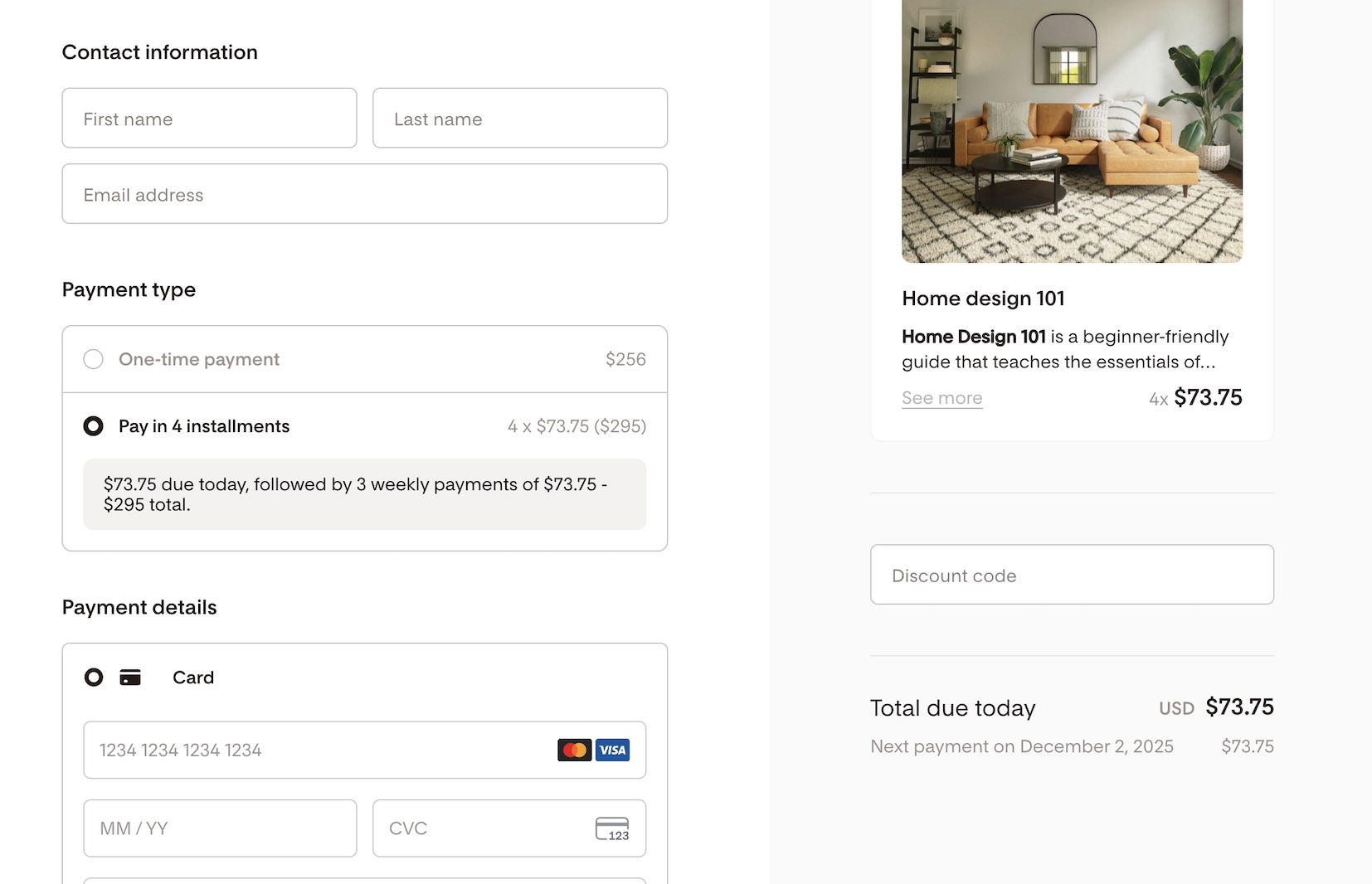 “$73.75 due today, followed by 3 weekly payments of $73.75 - $295 total.”