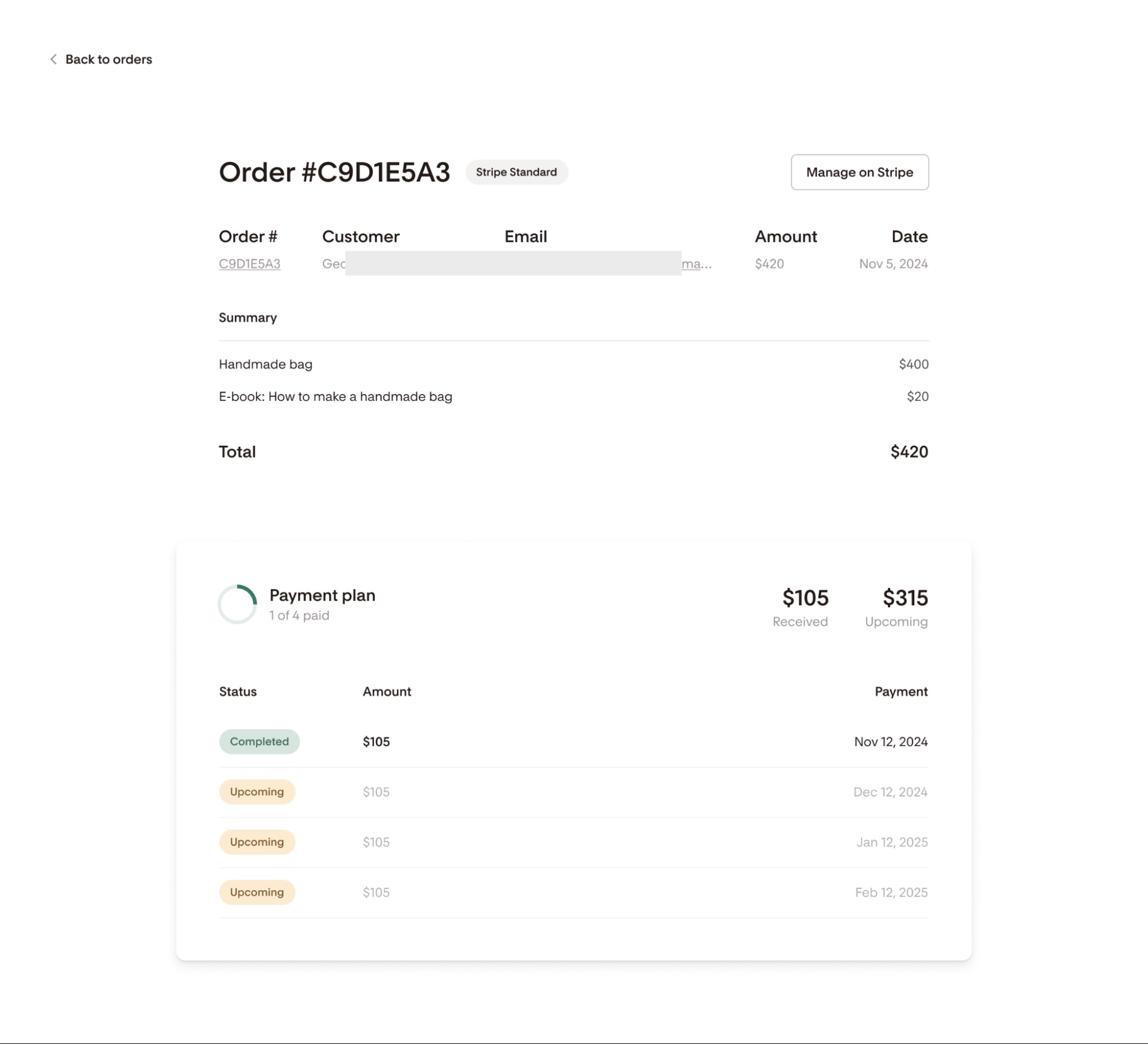 Clicking a specific order number displays additional information and a “Manage on Stripe” button that takes you to Stripe Standard, where you can manage the order.